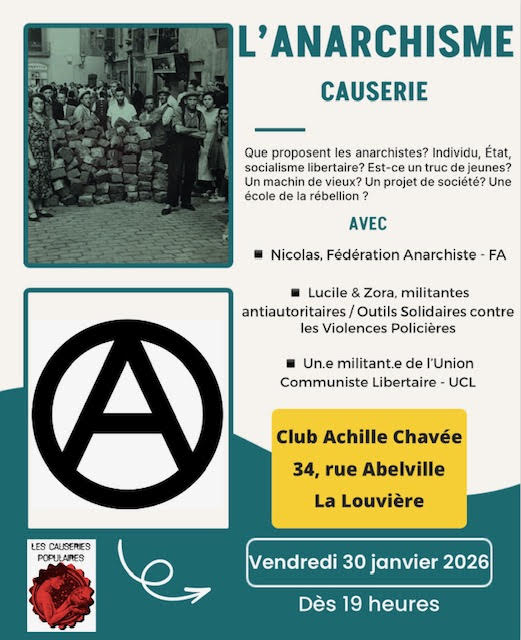 Venez rencontrer ou découvrir l'anarchisme lors de cette causerie publique avec et entre plusieurs militantEs de différentes organisations anarchistes et militantEs antiautoritaires.